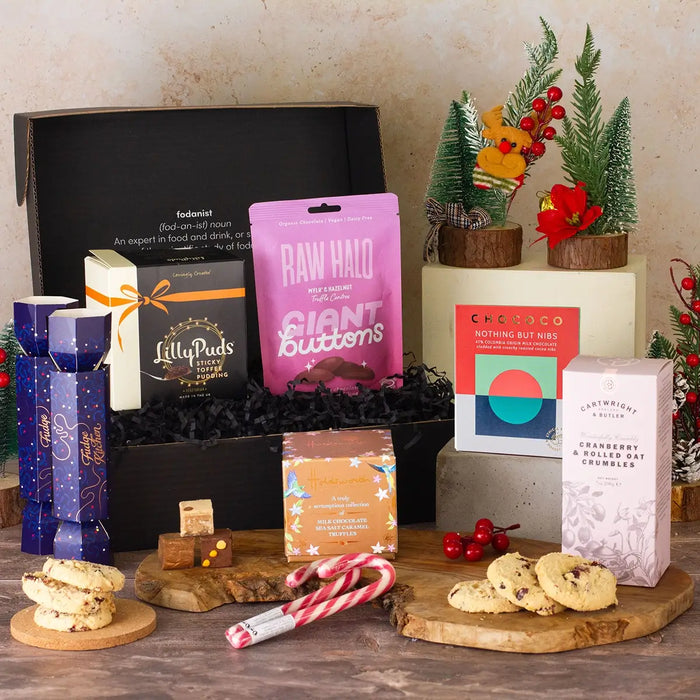 Our Festive Treats Gift Box is shipped in one of our signature eco-friendly FodaBox branded kraft boxes.