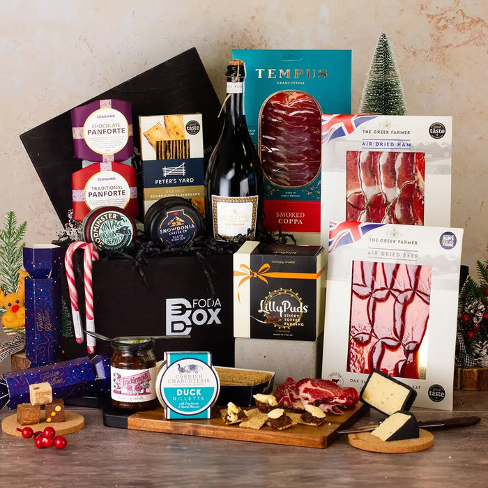 Raise a glass of Kingfisher Bay Marlborough Sauvignon Blanc or Barón de Barbón Oak Aged Rioja as you savour indulgent treats including Cornish Charcuterie Duck Rillette with Cranberries & Grand Marnier, Snowdonia Black Bomber Cheddar, and Peter’s Yard Sourdough Crackers paired with Tracklements Sticky Fig Relish. Sweet temptations abound with LillyPuds Sticky Toffee Christmas Pudding, Seggiano Classic Christmas Panettone, *Grandma Wild’s Brandy Mince Pies (*PLEASE NOTE ... this product has been swapped for Seggiano Chocolate Panforte due to stock level),Joe & Seph’s Milk Chocolate Popcorn Stars, Stockley’s Christmas Pudding Fudge, Farmhouse Chocolate Brownie Biscuits, and Charles Chocolate Honeycomb — each crafted to delight and impress.
