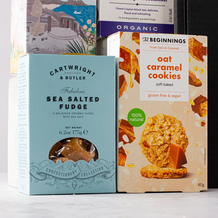 Brew a pot of beautifully balanced tea from the New English Teas Vintage Victorian Classic Tea Tin, packed with 40 English Breakfast teabags, and serve alongside freshly baked scones made from Wrights Scone Mix, generously topped with Devon Clotted Cream and Frutteto Strawberry Preserve. Enjoy slices of rich Coolmore Fruit Cake and buttery Your Piece Classic Shortbread for a truly indulgent spread. To complete the experience, there’s smooth Cartwright & Butler Salted Caramel Fudge and a delicious Traybakes Caramel Shortcake with Milk Chocolate – the perfect finishing touches to an elegant afternoon.