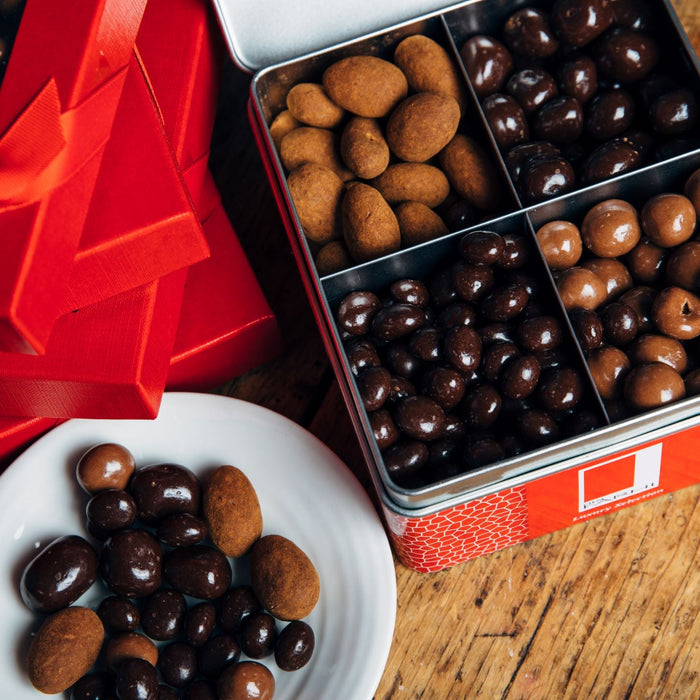 Four gorgeous fruits and nuts coated in velvety chocolate. This gift tin features pieces of crystallised ginger encased in premium dark chocolate; plump Californian almonds smothered in delicious milk chocolate; coffee beans enrobed in a smooth dark chocolate and finally, tasty hazelnuts coated in milk chocolate to complete the set. This is a beautiful, ready to gift item that will be enjoyed by all.