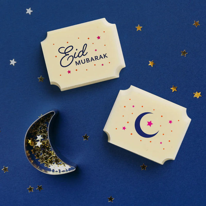 A luxury selection box of 16 filled artisan chocolates, featuring two special 'Eid' themed chocolates. Made with natural ingredients and hand-decorated with cocoa butter.
