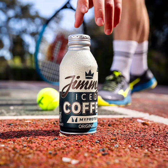 Hand reaching for a bottle of Jimmy's Iced Coffee - Myprotein Original Big BottleCan 380ml on a tennis court