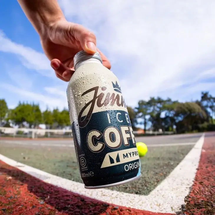Hand holding a bottle of Jimmy's Iced Coffee - Myprotein Original Big BottleCan 380ml on a tennis court