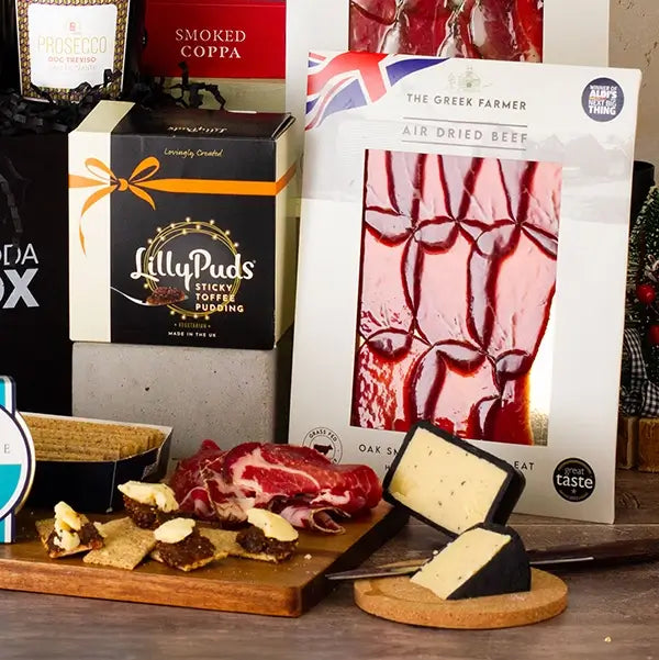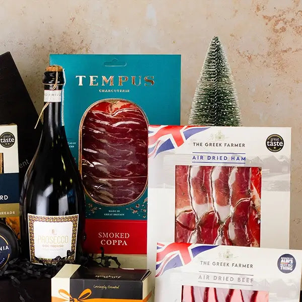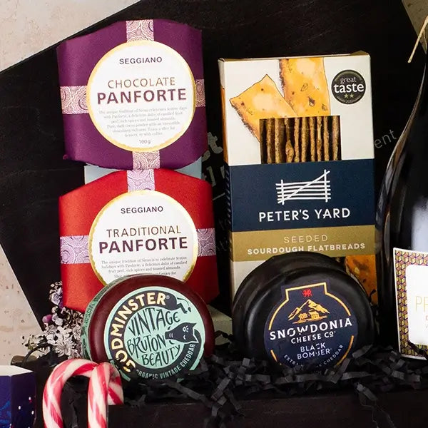 Raise a glass of Kingfisher Bay Marlborough Sauvignon Blanc or Barón de Barbón Oak Aged Rioja as you savour indulgent treats including Cornish Charcuterie Duck Rillette with Cranberries & Grand Marnier, Snowdonia Black Bomber Cheddar, and Peter’s Yard Sourdough Crackers paired with Tracklements Sticky Fig Relish. Sweet temptations abound with LillyPuds Sticky Toffee Christmas Pudding, Seggiano Classic Christmas Panettone, *Grandma Wild’s Brandy Mince Pies (*PLEASE NOTE ... this product has been swapped for Seggiano Chocolate Panforte due to stock level),Joe & Seph’s Milk Chocolate Popcorn Stars, Stockley’s Christmas Pudding Fudge, Farmhouse Chocolate Brownie Biscuits, and Charles Chocolate Honeycomb — each crafted to delight and impress.