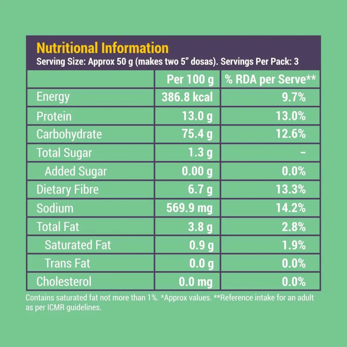 Supergrain blend (64%) (Foxtail millet flour, rice flour), moong dal (green gram)(16%) Urad Dal (black gram) (14%), iodised salt, spinach powder, spices (asafoetida, Curry Leaves, Cumin), onion flakes, and raising agent (baking soda) [INS 500(ii)]