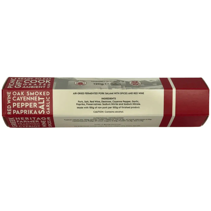Pork, Salt, Dextrose, Red Wine, Cayenne Pepper, Paprika, Garlic, Preservatives: Sodium Nitrate, Sodium Nitrite. Made with beef casings. Made with 155g of raw pork per 100g of finished product.