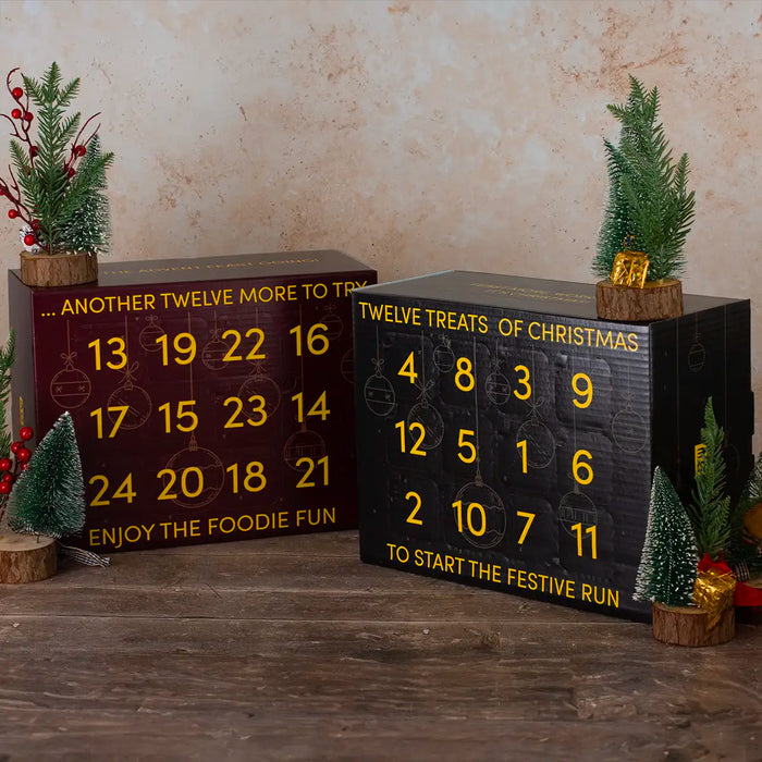 The 24 Day Gourmet Foodie Advent Calendar 2025 is packaged beautifully in a FodaBox branded advent calendar, featuring 12 windows across 2 sturdy boxes. The elegant packaging not only protects the delicious treats inside but also makes it a stunning gift for any occasion.